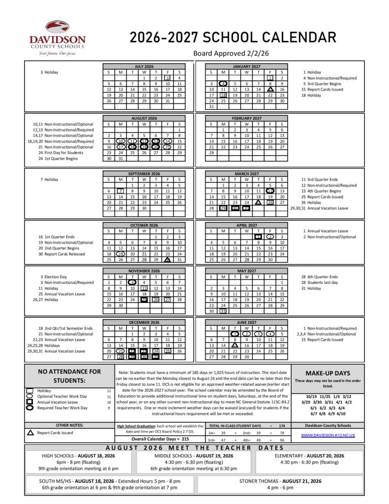 Below you can see a school calendar of the Davidson County Schools that is now available for the year 2025-2026. You can print this school calendar by downloading it from below. We have shared the link of the school website from where you can easily download a school calendar.