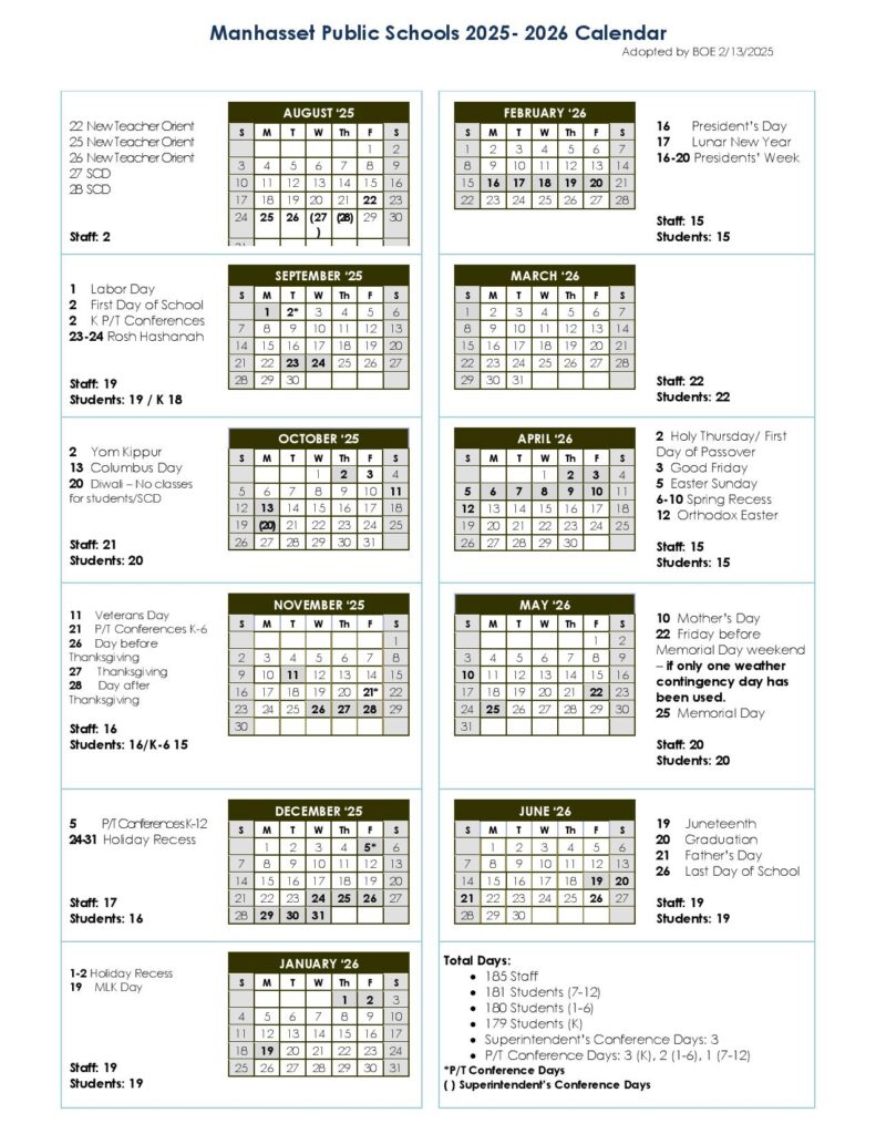 Check out the preview of Manhasset Schools Calendar below for the academic year 2025-2026. A school calendar contains the official academic schedule for this academic year, so keep a check on it and plan your personal schedule accordingly. A school calendar is important for students, parents, teachers, and staff. Make sure to download and print your school calendar and start planning for important dates.