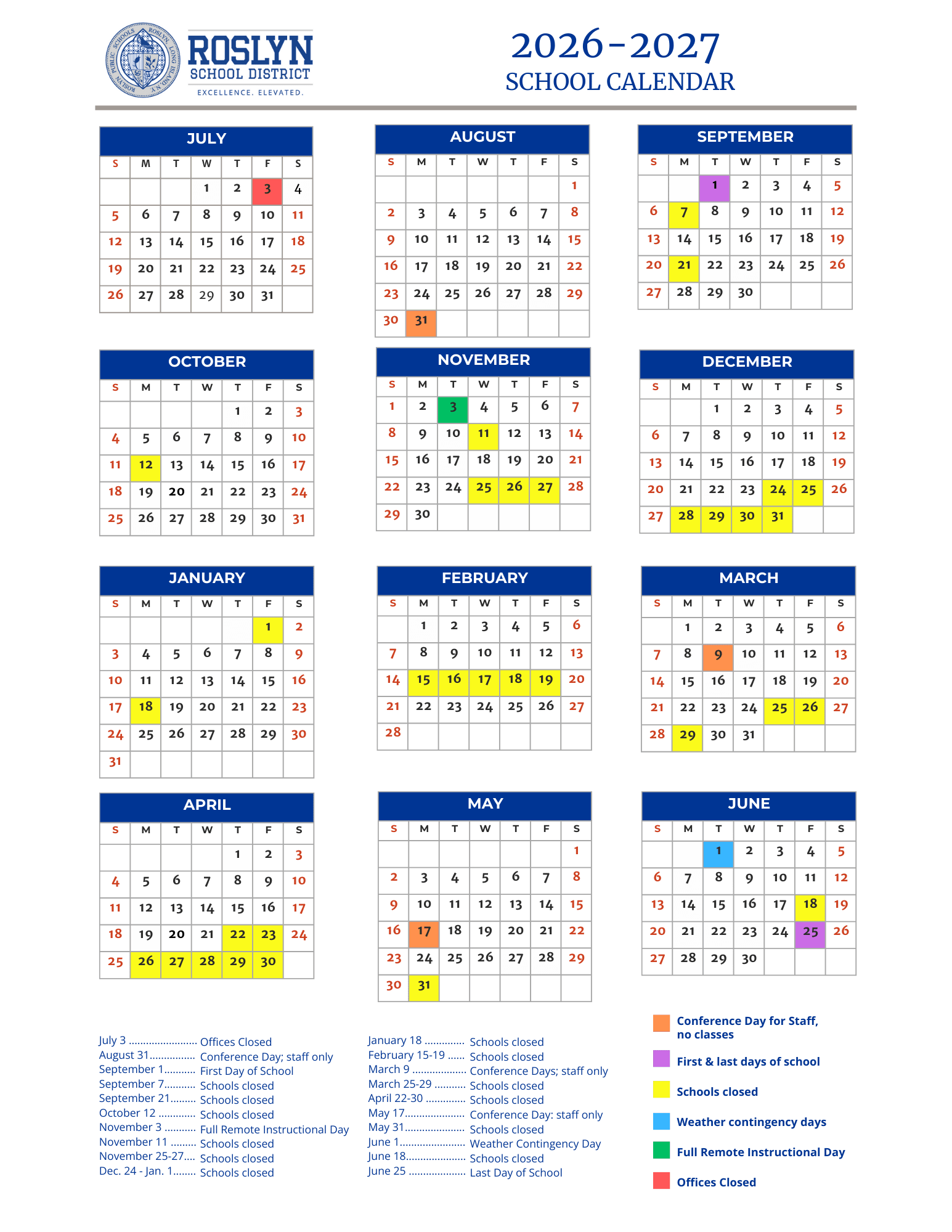 Roslyn Schools Calendar 2026-2027 in PDF